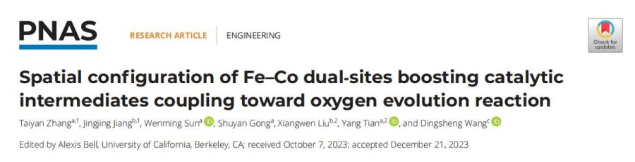 近日,幸运彩分析测试研究所(北京市理化分析测试中心)在《美国科学院院报》(PNAS)发表了题为“Spatial configuration of Fe–Co dual-sites boosting catalytic intermediates coupling toward oxygen evolution reaction”的文章(https://doi.org/10.1073/pnas.2317247121)。该论文通过构建两种不同空间构型的Fe-Co双位点催化剂,研究双位点催化剂中两个金属活性位点的空间构型促进OER(析氧反应)的催化机制。相关实验研究证明了双位点催化剂(DSCs)在OER中的协同效应,超过了单位点催化剂,展示出双位点催化剂空间构型的设计在OER领域的巨大潜力。