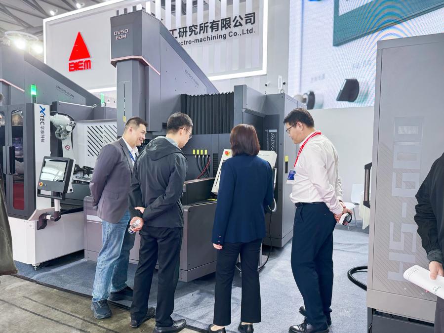 郭建梅向苏国斌副局长等人全面介绍了北京电加工所的发展历程、先后承担国家重大科技专项以及此次参展的MH10微孔电火花加工系列产品、HS600精密数控电火花小孔系列产品、ADV600精密数控电火花成形机系列产品、数控A系列中走丝、M50 CNC PCP/PCBN 刀具自动磨床等系列化的自主知识产权产品,电加工所作为北京市属企业,展示了北京工业母机企业的雄厚实力与技术优势,体现了国企担当。苏国斌肯定了我公司的成绩,同时也传达了北京市对工业母机制造企业的支持,期望电加工所在未来要保持初心,加大科技创新力度,为北京国际科技创新中心建设贡献力量。 (北京市电加工研究所有限公司)