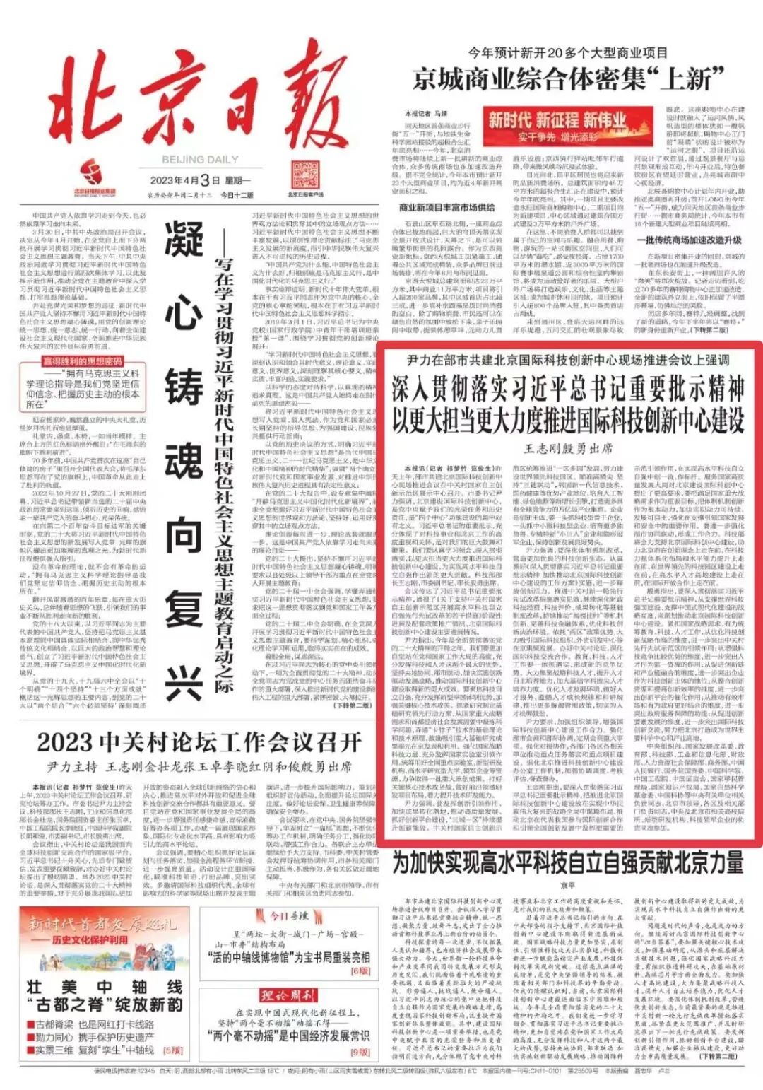 4月2日上午,部市共建北京国际科技创新中心现场推进会议在中关村国家自主创新示范区展示中心召开。市委书记尹力强调,北京建设国际科技创新中心,是党中央赋予我们的光荣任务和历史责任,是“四个中心”功能建设的题中应有之义。习近平总书记的重要批示,充分体现了对科技事业和北京工作的高度重视和关怀,是对我们的巨大鼓舞和鞭策。我们要认真学习领会、深入贯彻落实,以更大担当更大力度推进国际科技创新中心建设,为实现高水平科技自立自强作出新的更大贡献。科技部部长王志刚,市委副书记、市长殷勇出席。
