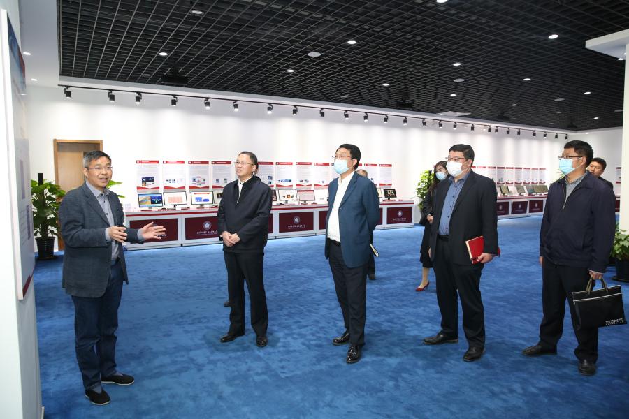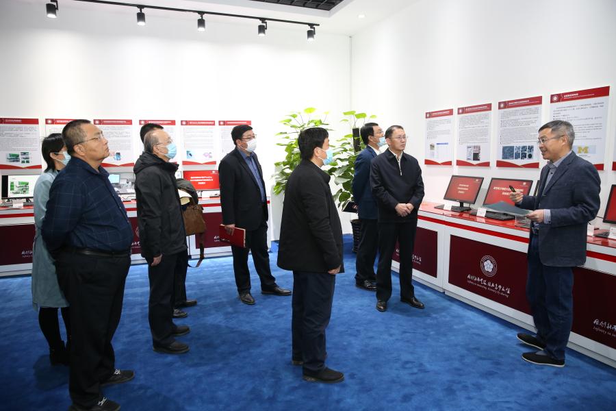 伍建民一行首先参观了协同院展示厅。王茤祥介绍了协同院“研究所—协同创新中心—创新基金”的三元耦合协同机制,即创新基金决策、产业协同创新中心运营、专业研究所攻关;“双课堂、双导师、双身份、双考核”,国内外大学协同培养研究生,促进学生接替传承与技术有序转移相结合等,重点介绍了协同院近年来的科技成果转化情况。例如,“金属透明电极及其制备工艺”,可替代ITO膜用于显示屏、触摸屏、太阳能电池、电子纸等产品,满足可穿戴电子设备的柔性需求,已完成中试、组建公司,启动产品推广应用;“微型化双光子荧光显微镜”“智能超灵敏活细胞超分辨显微镜”技术,已经产业化,并占有一定的市场份额;“iRGD抗肿瘤靶向药物输送系统和分子示踪剂”技术,可以将抗癌药和示踪剂送达瘤内,有效提高药物疗效、降低毒副作用;“磁悬浮飞轮储能”技术,可应用于数据中心、半导体、新能源储能等领域,等等。