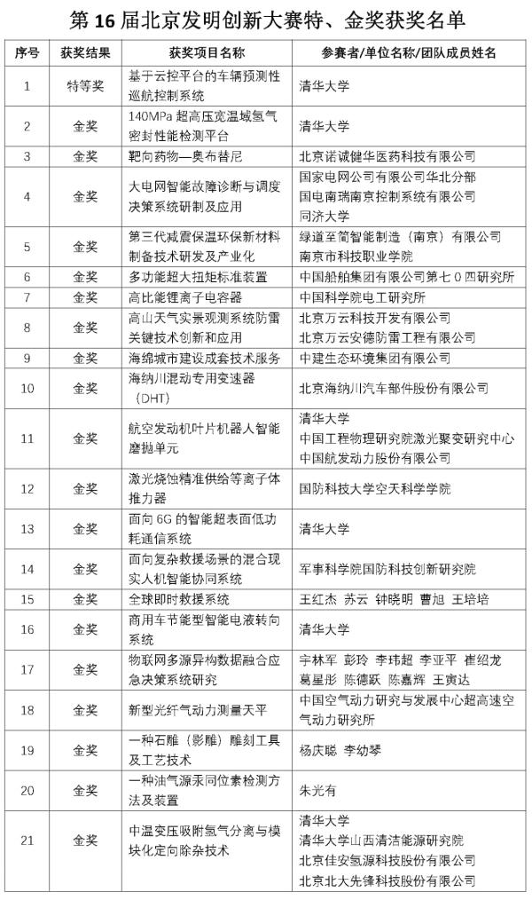 第16届北京发明创新大赛自2021年9月28日拉开序幕,至2022年1月7日报名截止,共有来自全国32个省市自治区的1600个项目参与了网上报名。发明创新奖共评选出分为1项特等奖、20项金奖、70项银奖、139项铜奖、748项入围奖。本届大赛同步设立了15项专项奖,75项各具特色的参赛项目获得奖励。恭维幂宣读第16届北京发明创新大赛颁奖决定,张宇蕾揭晓特等奖,刘清珺揭晓金奖,北科控股、北京发明协会相关负责同志分别揭晓银奖和铜奖。本届大赛特等奖是清华大学参赛项目“基于云控平台的车辆预测性巡航控制系统”,金奖项目中有中科院、军科院、中国工程物理研究院等大院大所,有清华大学、同济大学、国防科大等重点高校,有北汽、中建、中船、国家电网等大型企业,也有中小微企业、发明创新团队和发明者个人的项目,可谓群贤毕至、百花齐放,凸显出了鼓励大众创新、弘扬科学精神的办赛初心,用独特的视角发现大众创新的火花,用科学的态度孵化无限创意的多姿多彩,搭建起了激发全社会创新活力和创造潜力的平台。