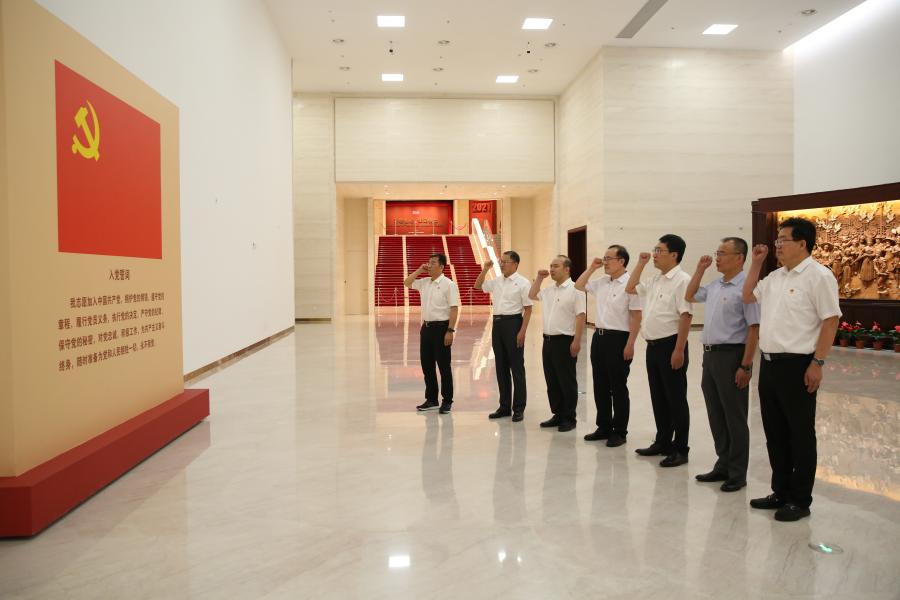 在党史展览馆宣誓厅,面向鲜红的党旗,院党组书记方力带领院领导伍建民、卫万顺、邵锦文、刘清珺、卢宇国、刘子亮重温入党誓词。