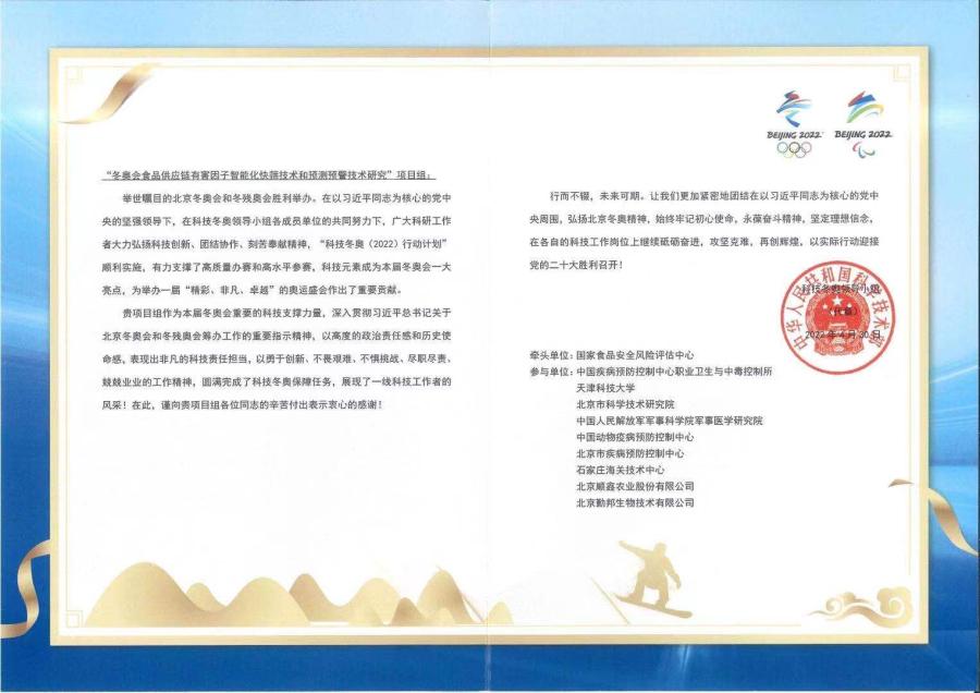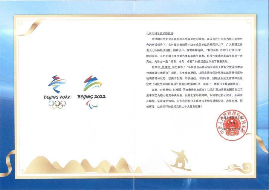 近期,幸运彩收到科技冬奥领导小组发来的感谢信,分别对我院承担科技冬奥项目的科研团队和课题负责人刘清珺研究员表示感谢。信中指出,在2022北京冬奥会和冬残奥会举办期间,我院科技人员作为科技冬奥项目“冬奥会食品供应链有害因子智能化快筛技术和预测预警技术研究”课题“冬奥食品供应链风险监控预警智能系统的研发与应用示范”承担人,出色完成了课题科研任务和技术保障任务,展现了一线科技工作者的风采,科技冬奥领导小组对此表示衷心的感谢!