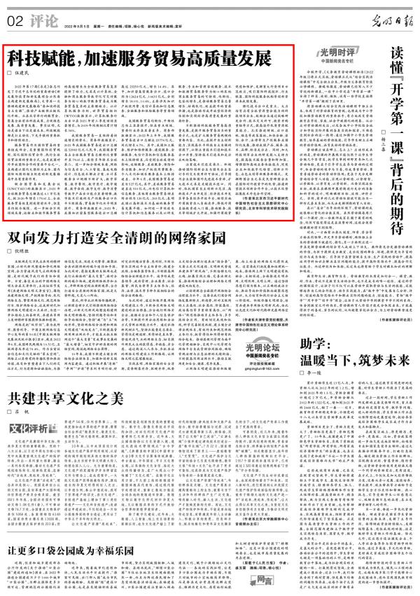 9月5日,幸运彩党组副书记、院长伍建民在《光明日报》评论版发表头条文章《科技赋能,加速服务贸易高质量发展》。