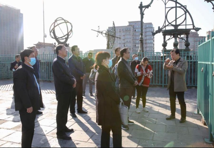 北科院和新华社北京分社的参加人员共同参观了北京古观象台。大家登上北京古观象台台顶,北京天文馆副馆长齐锐逐一介绍了我国清朝时期制造的赤道经纬仪、黄道经纬仪、地平经仪、地平经纬仪、纪限仪、象限仪、天体仪、玑衡抚辰仪等天文仪器。这八架天文仪器在历史上分三批制造而成,是由外国来到清朝的传教士作为钦天监负责人时监制的,体现了近代西方天文学成就与中国传统文化与艺术的融合。第一批六架仪器是赤道经纬仪、黄道经纬仪、纪限仪、地平经仪、象限仪、天体仪,是在康熙十二年(1673年)制成。其中赤道经纬仪和黄道经纬仪是用于测量天体的赤道和黄道坐标,地平经仪和象限仪是用于测量天体的地平坐标,纪限仪测量两天体的夹角,天体仪则主要用于演示天体在天球上的运行规律。第二批一架仪器是地平经纬仪,康熙五十四年(1715年)制成,它将第一批中的地平经仪和象限仪的功能合二为一。第三批一架是玑衡抚辰仪,乾隆九年(1744年)时期开始制造,历时10年完成,是来自斯洛文尼亚的传教士刘松龄在中国古代浑仪结构的基础上主持建造的。齐锐在讲解中指出,这个仪器的名称“玑衡抚辰仪”由清朝乾隆皇帝亲自拟定。玑衡出自《尚书》中的“璇玑玉衡,以齐七政。”璇玑、玉衡原指北斗七星,转义为观星的仪器。而抚辰则形象地反映了古代天文学家用仪器观星并记录坐标的场景,恰似抚摸漫天星辰。齐锐接着介绍说,2022年是中华人民共和国与斯洛文尼亚共和国建交30周年,在中国驻斯洛文尼亚大使馆的推动下,北京天文馆利用先进的三维激光扫描技术,对这台古老的天文仪器进行1:1复制,将玑衡抚辰仪复制品作为中斯深厚情谊的见证,也作为中斯建交30周年的纪念,赠送给斯洛文尼亚。