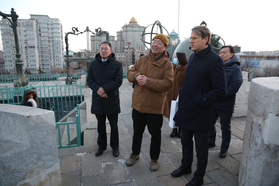 座谈结束后,大家移步古观象台台顶,参观陈列于此的古天文仪器,特别是清朝乾隆时期制造的玑衡抚辰仪。这架号称“新制浑仪”的仪器,耗时10年于1754年制造完成,是大型青铜古典天文仪器的最后杰作,其外形是中国传统浑仪样式,但细节上又具有很多欧洲仪器的特点,是中国古代传统仪器与西方计量刻度的完美结合,更是中斯科技交流、文明互鉴的典型标志。