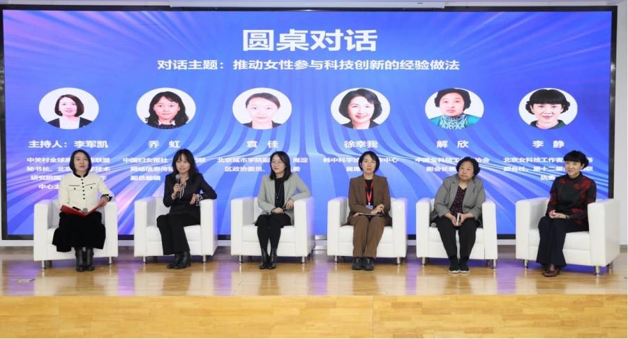 圆桌对话环节,中国妇女报社(全国妇联网络信息传播中心)副总编辑(副主任)乔虹,北京城市学院副校长、海淀区政协委员、妇联执委袁佳,韩中科学技术合作中心首席代表徐幸我,中国女科技工作者协会副会长兼秘书长解欣,北京女科技工作者协会常务副会长、第十二届全国妇联执委李静结合各自在STEM领域及创新创业工作当中的亲身经历与发展历程,分享促进女性科技工作者职业发展与创新产业化发展等方面有效政策、支持举措,讲述成功经验,及女性从事科技创新创业相关工作中的机遇与挑战。李军凯主持圆桌对话环节。